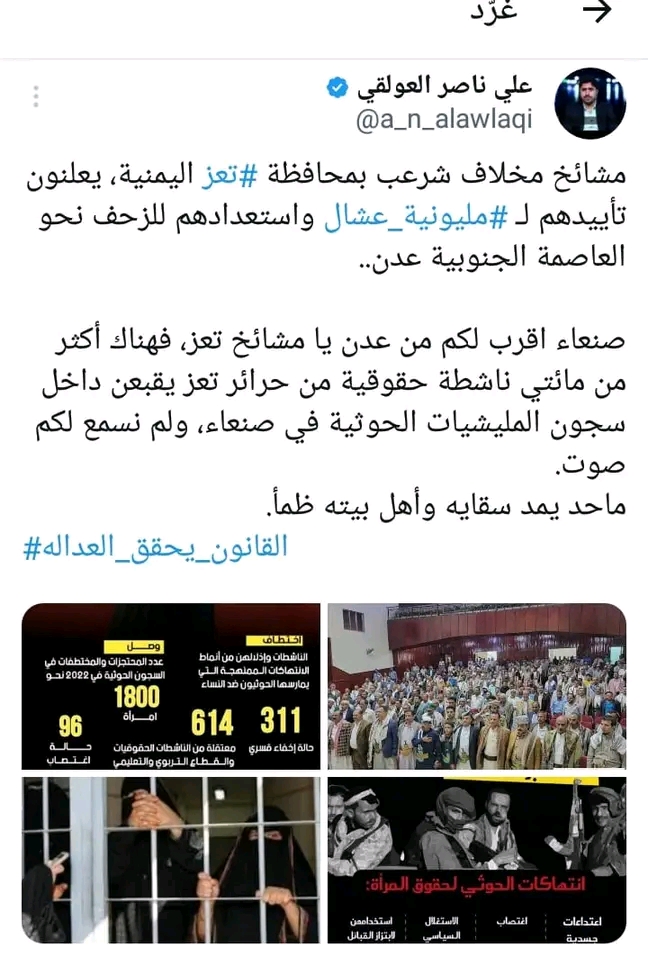 وعلق نشطاء جنوبيون بان صنعاء اقرب لهم من عدن يامشائخ تعز فهناك اكثر من 200 ناشطة حقوقية من حرائركم يقبعن داخل سجون المليشيات الحوثية ولم نسمع لكم صوت