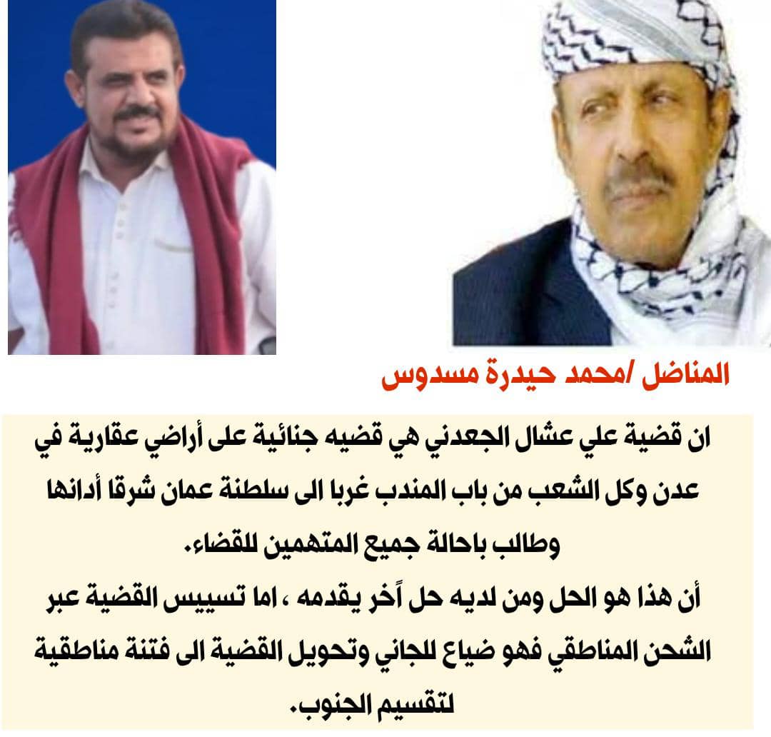 1- ان قضية علي عشال الجعدني هي قضيه جنائية على أراضي عقارية في عدن وكل الشعب من باب المندب غربا الى سلطنة عمان شرقا أدانها وطالب باحالة جميع المتهمين للقضاء.