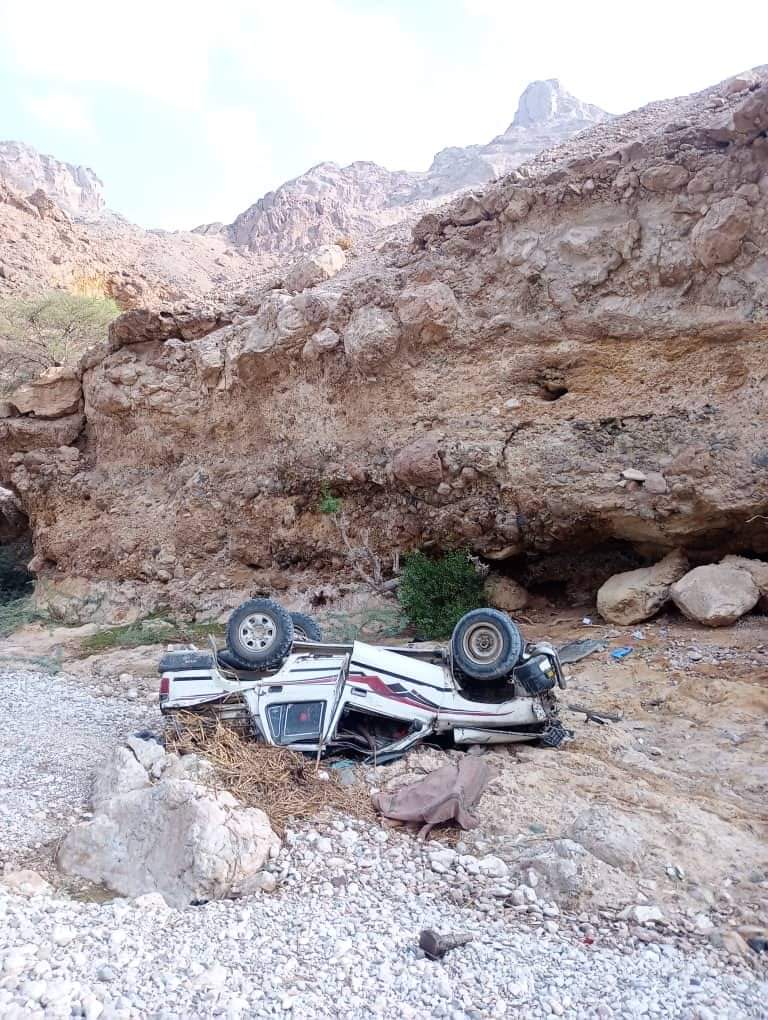 توفي مالا يقل عن اربعة اشخاص على الفور بعد انزلاق سيارة هايلوكس كانوا يستقلونها من فوق منحدر جبلي شاهق على طريق المكلا حجر
