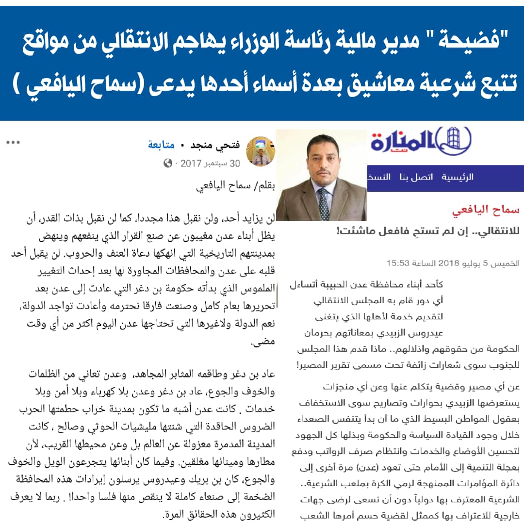 العنوان السابق هو أحد المقالات التي يتم توزيعها باسم سماح اليافعي وهو (أسم مستعار لفتحي منجد أحد أبناء صعدة اليمنية يعمل مدير حسابات رئاسة الوزراء بحيث يستهدف الجنوب و الانتقالي من خلال النشر في عدة مواقع منها