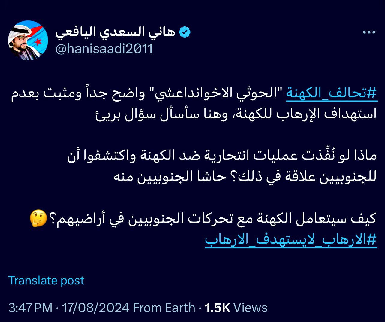 وقال السعدي في تغريدة على منصة إكس إن: “تحالف الكهنة “الحوثي الاخوانداعشي” واضح جداً ومثبت بعدم استهداف الإرهاب للكهنة”.