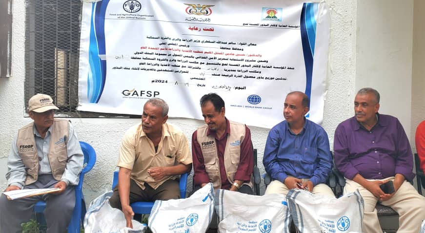برعاية معالي وزير الزراعة الري والثروة السمكية اللواء/سالم عبدالله السقطري والدكتور حسين جادين ممثل منظمة الأغذية والزراعة التابعة للأمم المتحدة الفاو دشن مدير عام المؤسسة العامة لإكثار البذور المهندس أحمد عوض الحروري برفقة مدير عام مكتب الزراعة في محافظة أبين ومدير عام مديرية زنجبار ورؤساء وأعضاء الجمعيات التعاونية الزراعية مديرية زنجبار صباح اليوم الأحد توزيع الذرة الرفيعة صنف بيني لعدد 100مزارع في مديرية زنجبار ضمن مشروع الاستجابة لتعزيز الأمن الغذائي في اليمن.