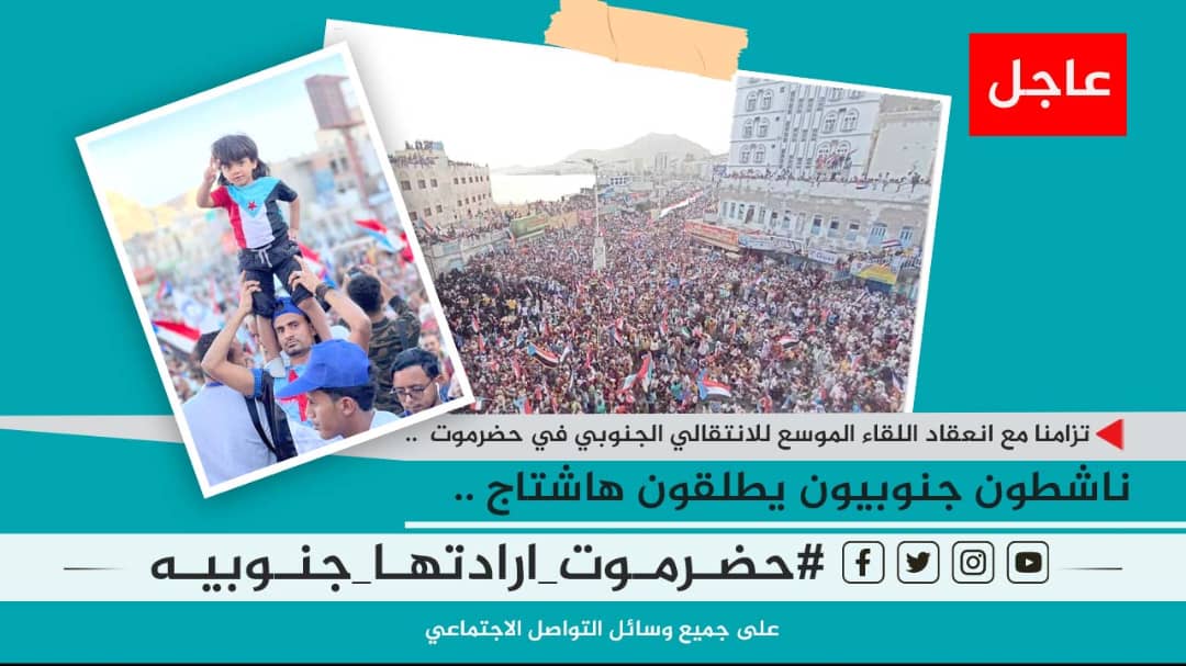 وتزامن الهاشتاج مع انعقاد اللقاء الموسع لقيادات المجلس الانتقالي الجنوبي في محافظة حضرموت صباح اليوم الإثنين، للوقوف أمام مستجدات الأوضاع بالمحافظة، ودعم مطالب ابنائها المشروعة المتمثلة باستعادة دولة الجنوب كاملة السيادة، ورفضهم أي تمثيل لحضرموت لا ينطلق من إرادة أبنائها في جنوبية حضرموت.
