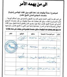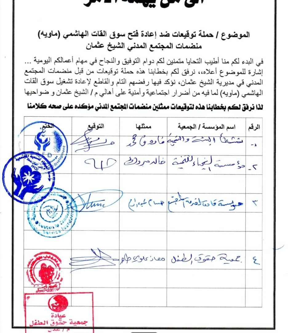 وشملت حملة التوقيعات حوالي 13 منظمة مجتمع مدني وذلك يأتي امتدادا وتأكيدا للرفض الشعبي تجاه الحكم الصادر بعودة السوق وسجن مدير مديرية الشيخ عثمان لرفضه عودت السوق بعد نقله قبل أكثر من سنة استجابة لمناشدات المجتمع المحلي حيث كان السوق يشكل خطر نتيجة الاشتباكات الحاصلة والازدحام .