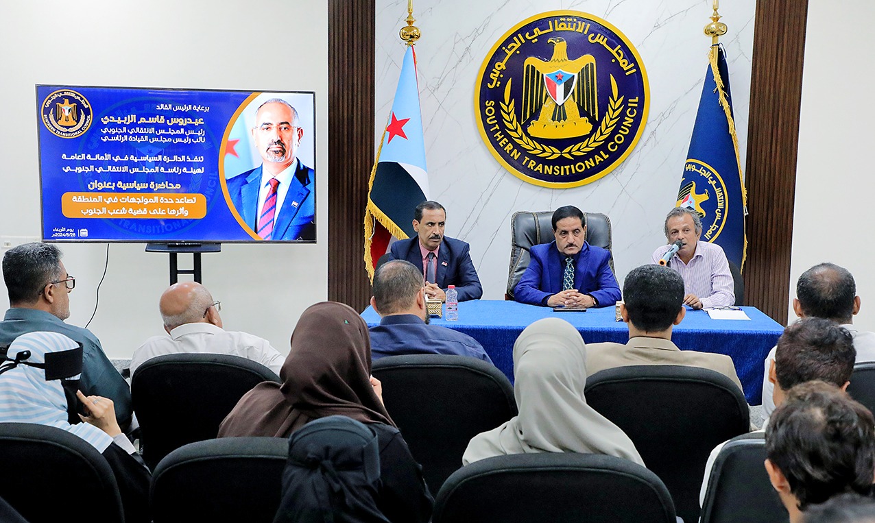 نظمت الدائرة السياسية بالأمانة العامة لهيئة رئاسة المجلس الانتقالي الجنوبي، اليوم الأربعاء في العاصمة عدن، محاضرة سياسية بعنوان “تصاعد حدة المواجهات في المنطقة وأثرها على قضية شعب الجنوب”.