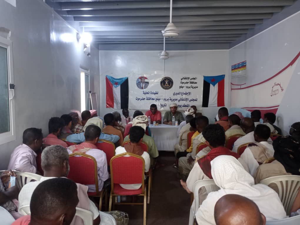 عقدت القيادة المحلية للمجلس الإنتقالي الجنوبي بمديرية بروم ميفع بمحافظة حضرموت ،عصر اليوم الجمعة ،اجتماعها الدوري للفصل الثاني لعام ٢٠٢٤م ،برئاسة الأخ ناصر سالمين التميمي رئيس الهيئة التنفيذية للقيادة المحلية للمجلس الإنتقالي الجنوبي بمديرية بروم ميفع م/ حضرموت .