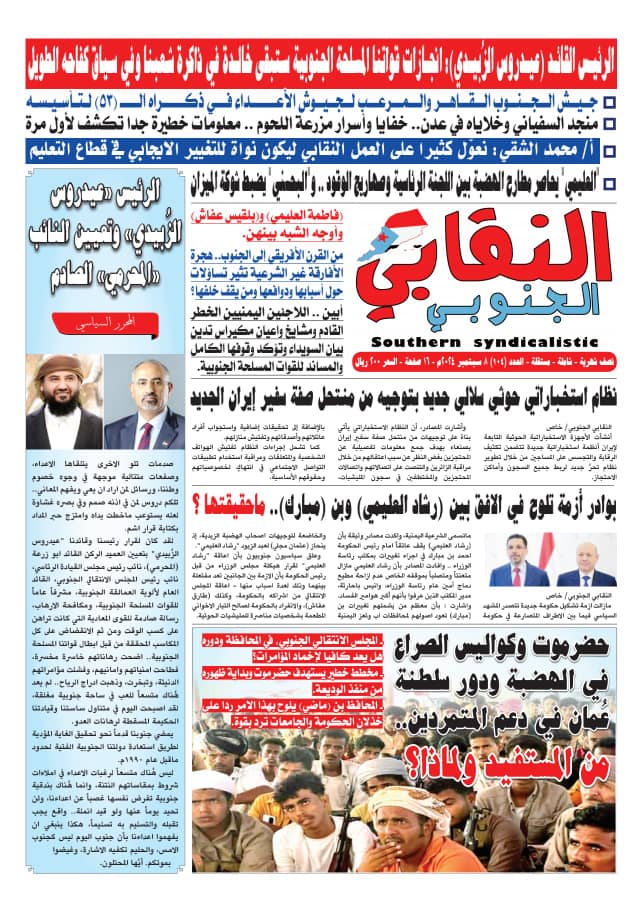 يحمل العدد الجديد( 104) صحيفة النقابي الجنوبي عددا من المواضيع الهامة التي تشهدها الساحة السياسية الجنوبية اهمها التالي