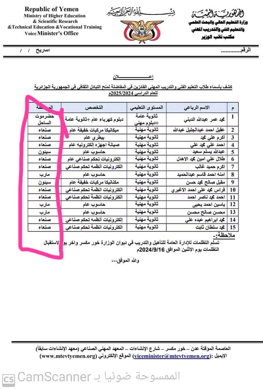 وفي الكشف الصادر عن وزارة التعليم العالي الذي يراسها الوزير الوصابي والمتضمن اسماء طلاب التعليم العالي والتدريب المهني وبما اسماهم بالفائزين في المفاضلة لمنح التبادل الثقافي في الجزائر للعام 2025_2024 والبالغ عددهم< 15> طالب جلهم من أبناء الجمهورية العربية اليمنية