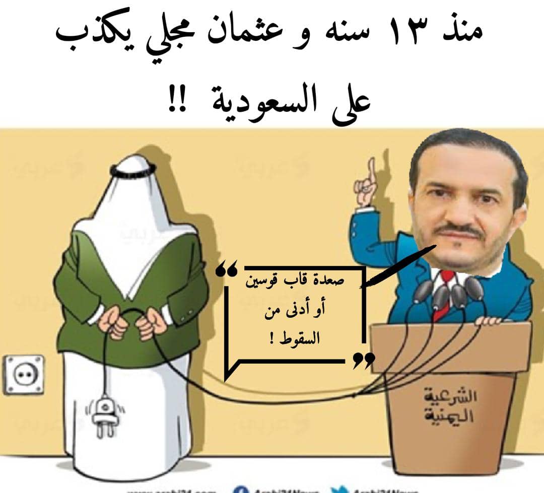 يتقن عثمان مجلي الكذب و تسويقه للتحالف العربي متظاهرا بالعداء مع الحوثيين، و بالاخير أتضح أنه المهرب الاول لمادة اليوريا المستخدمة في الصواريخ النفاذة التي تطلقها المليشيات الحوثية على مدن الشقيقة المملكة العربية السعودية