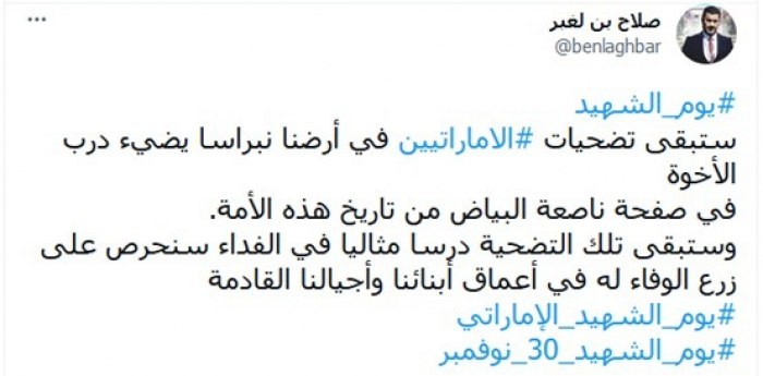 وأختتم تغريدتة بهاشتاجي: “يوم الشهيد الإماراتي، يوم الشهيد 30 نوفمبر”.