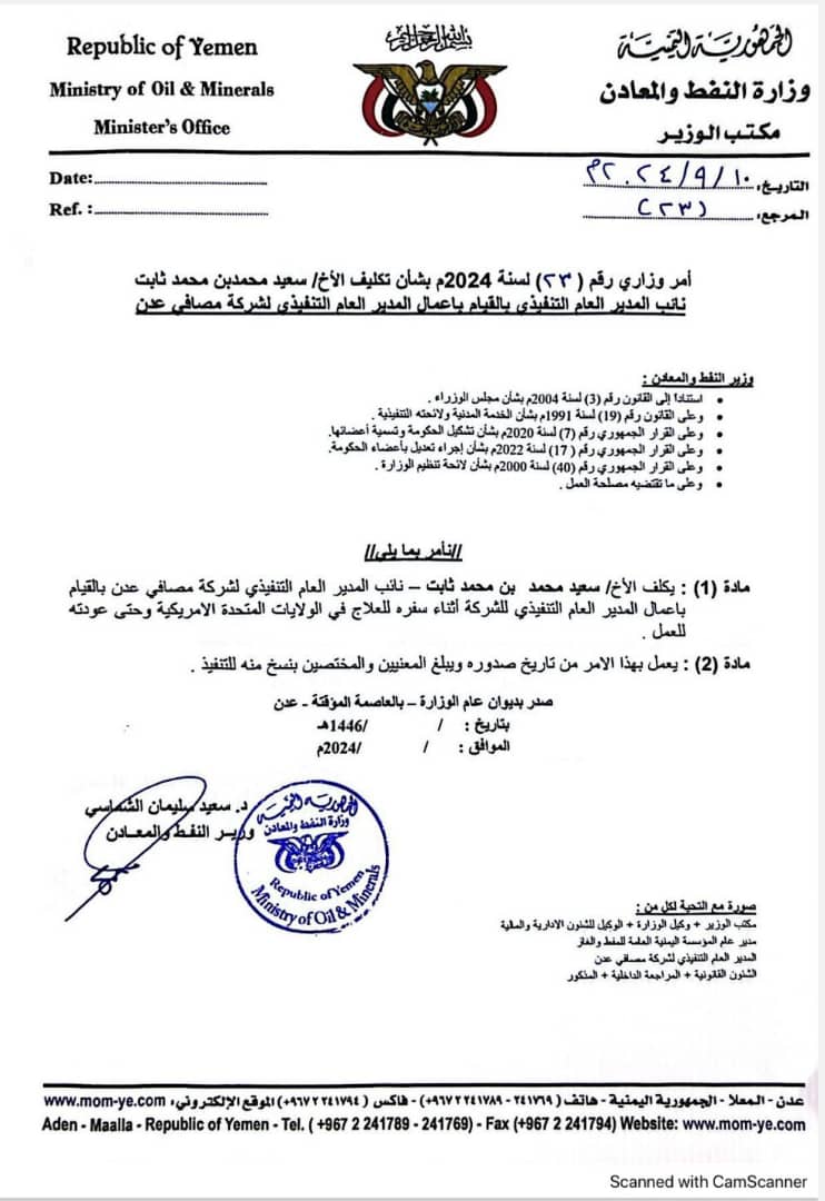وقضت المادة (1) بتكليف المهندس/ <سعيد محمد بن محمد >_ نائب المدير العام التنفيذي لشركة مصافي عدن بالقيام بأعمال المدير العام التنفيذي للشركة اثناء سفره للعلاج في الولايات المتحدة الأمريكية وحتى عودته للعمل