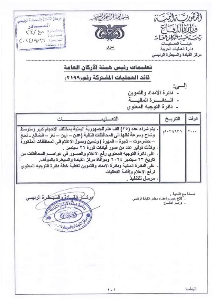 وجه رئيس هيئة الأركان قائد العمليات المشتركة اليمني الفريق الركن صغير حمود عزيز برقية تحمل أوامر تحت عنوان سري بتاريخ 16 سبتمبر 2024 إلى دائرة الإمداد والتموين والدائرة المالية ودائرة التوجيه المعنوي بشراء 25 ألف علم للجمهورية اليمني بمختلف الأحجام ما بين متوسط وكبير وشاح مشيرا إلى سرعة نقلها إلى محافظات عدن أبين الضالع لحج حضرموت شبوة والمهرة الجنوبية إضافة إلى محافظة تعز اليمنية مشددا على ضرورة تأمين وصول الأعلام إلى المحافظات المذكورة.