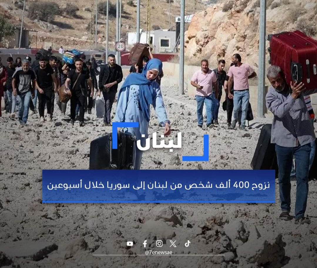 أعلنت وحدة إدارة مخاطر الكوارث التابعة للحكومة اللبنانية أن أكثر من 400 ألف شخص نزحوا من لبنان إلى سوريا، غالبيتهم سوريون، في غضون أسبوعين، أي منذ أن كثّفت إسرائيل غاراتها على مناطق مختلفة في لبنان.