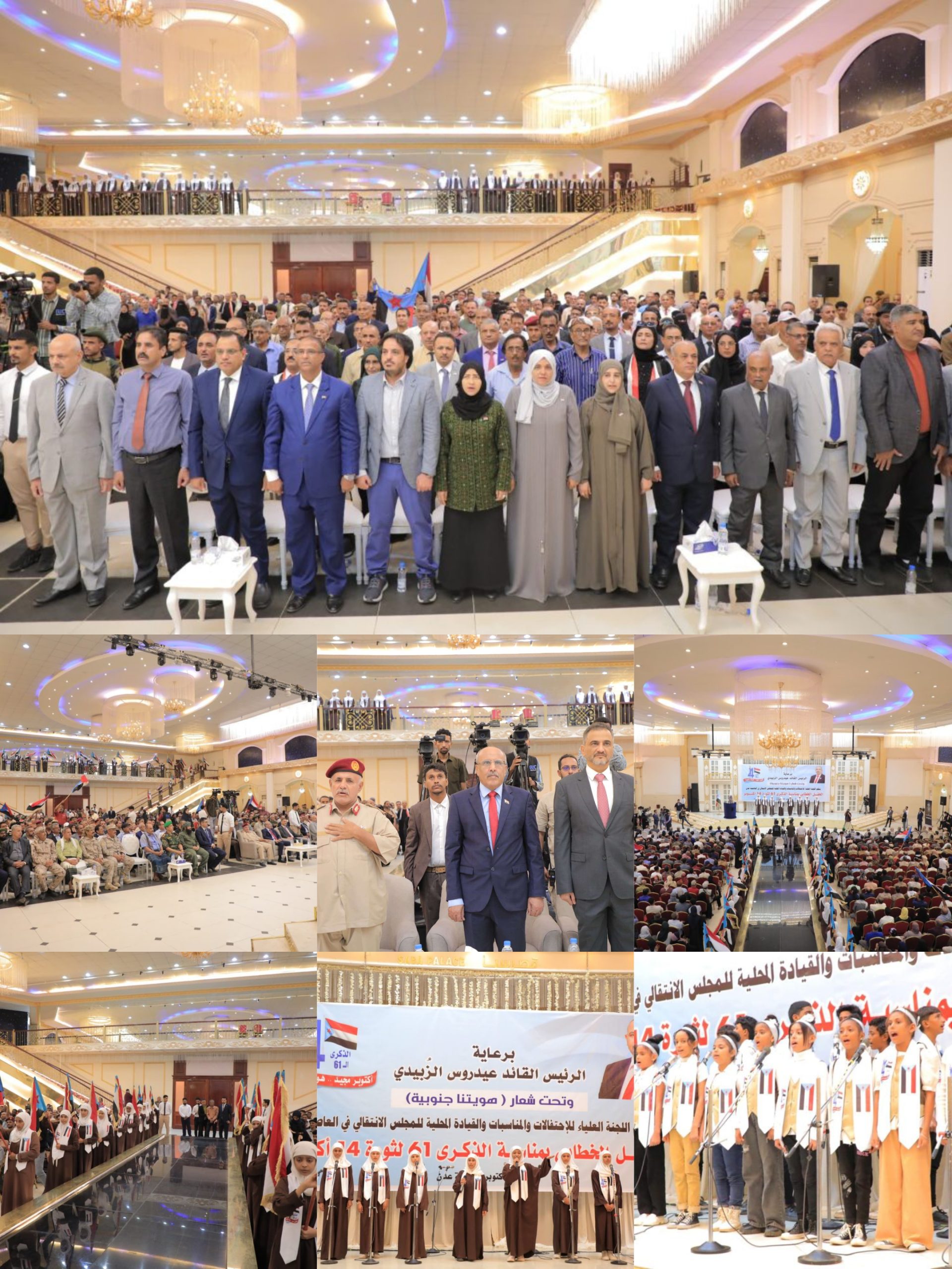 بمناسبة الذكرى الـ61 لثورة 14 أكتوبر وتحت شعار (هويتنا جنوبية).. اللجنة العليا للاحتفالات والمناسبات والقيادة المحلية للمجلس الانتقالي الجنوبي بالعاصمة عدن تقيم حفلاً فنياً وخطابياً