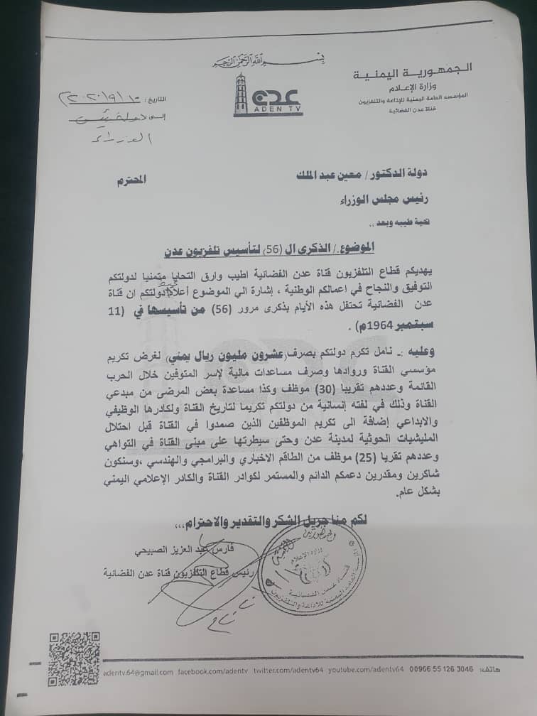وكانت وثيقة سابقة بتاريخ 1 / 12 / 2021م طلب فيها رئيس قناة عدن في الرياض فارس عبدالعزيز من وزير الاعلام معمر الارياني مخاطبة رئيس الوزراء باعتماد صرف مبلغ أربعين مليون ريال بصورة عاجلة بدعوى إعادة تشغيل القناة التي لا تزال مغلقة ويستثمر باسمها.