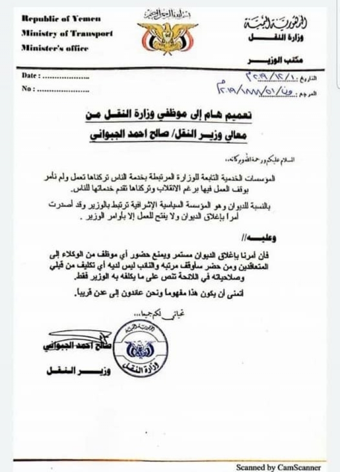 استمراراً لتمرده على اتفاق الرياض، أصدر المدعو صالح الجبواني توجيهاً جديداً باستمرار وقف العمل في ديوان وزارة النقل بالعاصمة عدن.