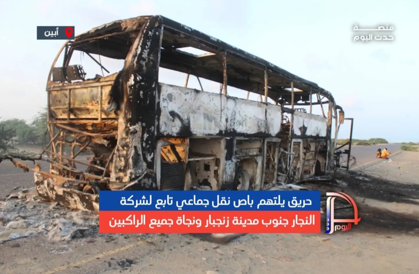 ابين.. تابع لشركة النجار.. باص نقل جماعي تلتهمه النيران جنوب مدينة زنجبار.. مامصير الركاب؟