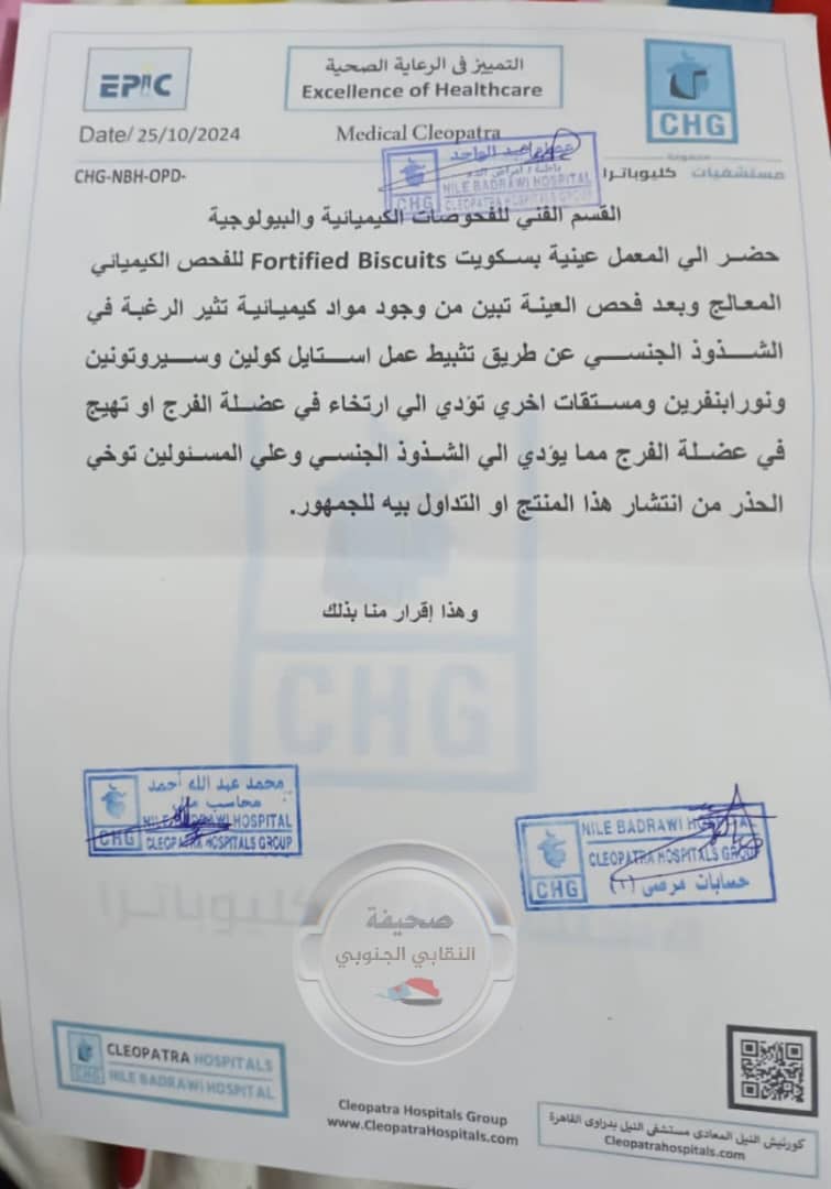 وحصل النقابي الجنوبي على نسخة من هذه التقارير جرت في احد المستشفيات بجمهورية مصر العربية على اصناف من نفس البسكويت الذي يوزعه برنامج الغذاء العالمي ومنعت هذه الأصناف في دول عربية عديدة بينها العراق، وفي حال ثبوت صحة هذه التقارير فأن ذلك تعتبر فضحية وجريمة بحق اطفالنا بمشاركة الحكومة اليمنية