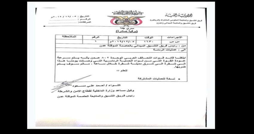 كشفت صورة لوثيقة سرية مسربة عن اصدار قيادة التحالف العربي بلاغا بعودة القوة من لواء الحماية الرئاسية الى شرق مدينة شقرة.