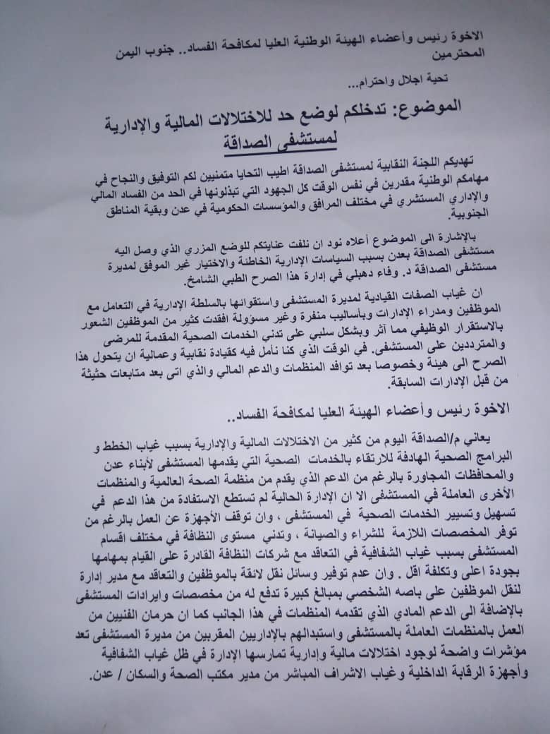 و اصدرت النقابة الطبية والصحية لمستشفى الصداقة بيان لها مشيره بشرح مفصل عن معاناة الموظفين والكادر الطبي وسياسة التنفير والتطفيش التي تنتهجها ادارة المستشفى ، و ما وصل اليه المستشفى من اهمال وتدهور من جميع النواحي و طالب البيان من الهيئة العليا لمكافحة الفساد بتدخلهم لوضع حد للأختلالات المالية والأدارية بسبب غياب الخطط والبرامج الصحية الهادفة للارتقاء بالخدمات الصحية التي يقدمها المستشفى لأبناء عدن والمحافظات المجاورة .