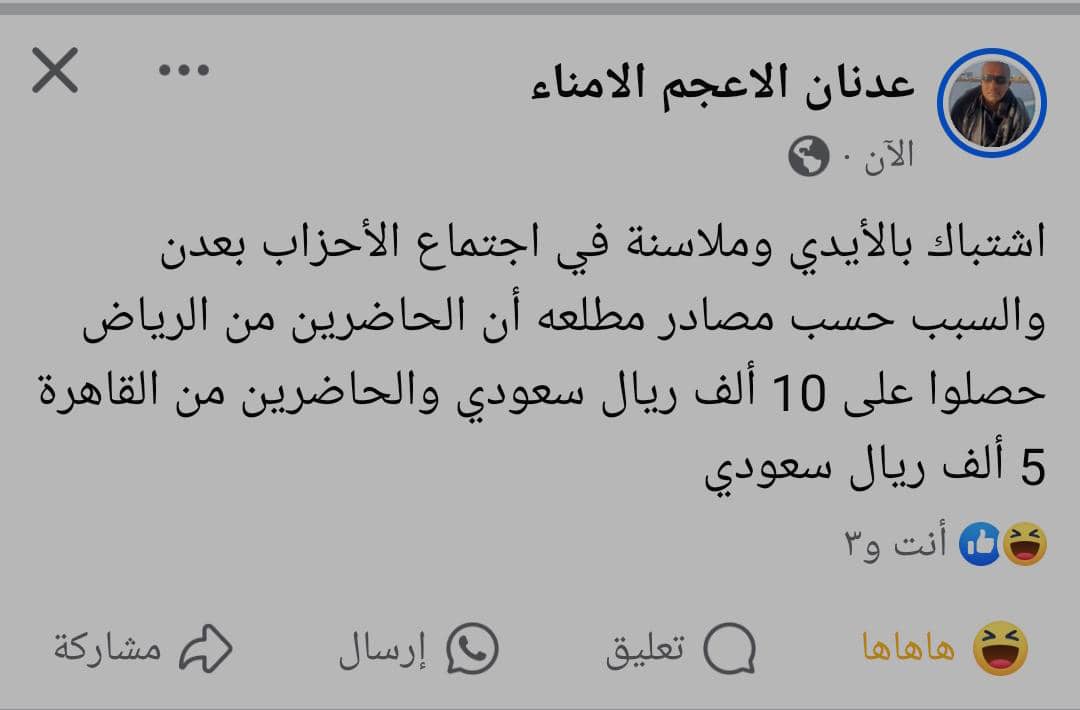 اكد الاستاذ عدنان الاعجم، رئيس تحرير صحيفة الامناء بأن اجتماع الاحزاب اليمنية في عدن يوم امس اسفر عن اشتباك بالايدي وملاسنة بين المشاركين.