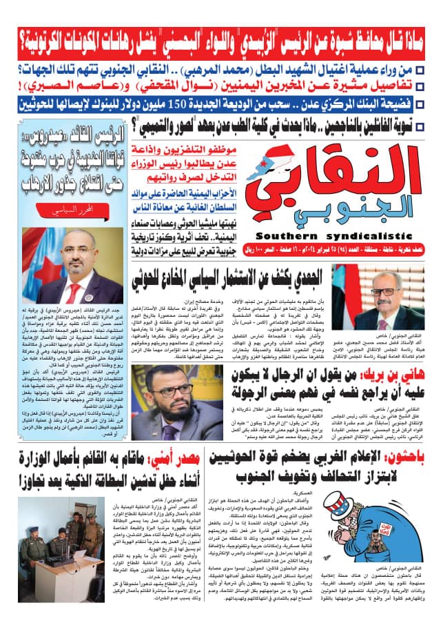 في عددها الجديد 94.. صحيفة النقابي الجنوبي يوم غداً الأحد في الاكشاك.. أحداث ساخنة وتطورات متسارعة
