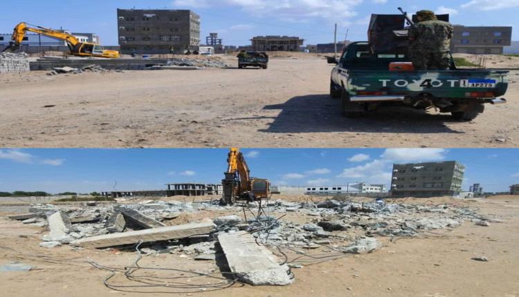 بتوجيهات الحالمي وحدة حماية الأراضي بعدن تزيل بناء عشوائي على أرضية أحد المواطنين في بئر فضل