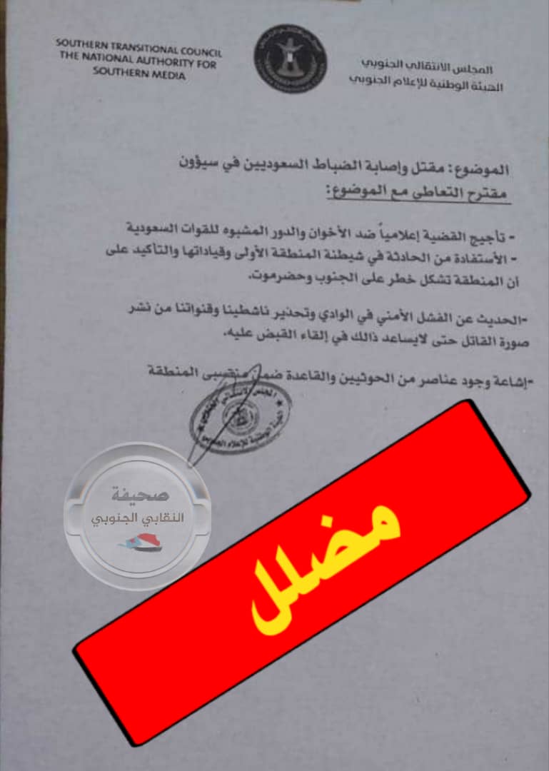 تحذر مصادر مسؤولة من تداول وثيقة مزيفة يُروّج لها عبر الذباب الإلكتروني التابع لجماعتي الحوثيين والإخوان، في محاولة مكشوفة للتشويش على جريمة استهداف جنود الواجب السعوديين في سيئون بوادي حضرموت يوم أمس.