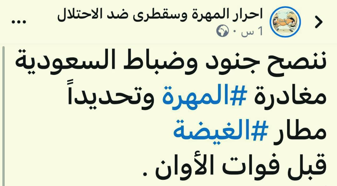 كشفت مصادر عن تلقي قوات الواجب السعودية في المهرة عن تهديدات مايسمون أنفسهم أحرار المهرة وسقطرى وهي منظمة سرية مشكلة من جنود شماليين وسلاليين يقودها المتحوث علي الحريزي وكيل المحافظة السابق.