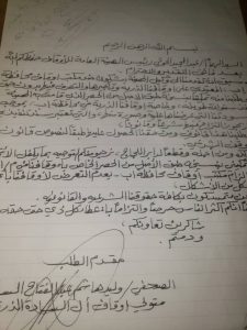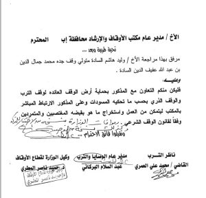 وتقدمت بشكاوي خطيه إلى وكيل الهيئه الاعيان جحاف مرفق لكم صوره من الشكوي وتم تصوير صورة طبق الاصل من المسودة الخاصه باوقاف اجدادي جمال الدين وعفيف الدين السادة وغيرهم والمذيله بحكم بات ونهائي وسند تنفيذي لكي يتم انصافي وإعادة ماتم تاجيرة من ارضي !