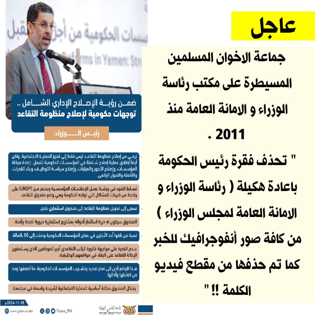اقدمت جماعة الاخوان المسلمين فرع اليمن المسيطرة على مكتب رئاسة الوزراء و الامانة العامة منذ 2011م” بحذف فقرة رئيس الحكومة باعادة هكيلة ( رئاسة الوزراء و الامانة العامة لمجلس الوزراء ) من كافة صور أنفوجرافيك للخبر كما تم حذفها من مقطع فيديو الكلمة.