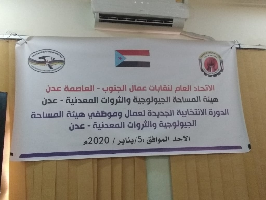 عُقد صباح اليوم الأحد في مقر هيئة المساحة الجيولوجيةوالثروات المعدنية ، الدورة الإنتخابية الجديدة لعمال وموظفي هيئة المساحة الجيولوجيةوالثروات المعدنية في العاصمة عدن ،بحضور الأخ/أحمد الزغير رئيس اللجنة التحضيرية لإتحاد العام لنقابات عمال الجنوب ونائبه الأخ/سامي خيران والمهندس/صلاح تواهي رئيس الهيئة التنفيذيةلكهرباء عدن.