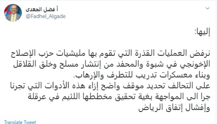 وقال الجعدي في تغريدة عبر “تويتر” : “نرفض العمليات القذرة التي تقوم بها مليشيات حزب الإصلاح الإخونجي في شبوة والمحفد من انتشار مسلح وخلق القلاقل وبناء معسكرات تدريب للتطرف والإرهاب”.