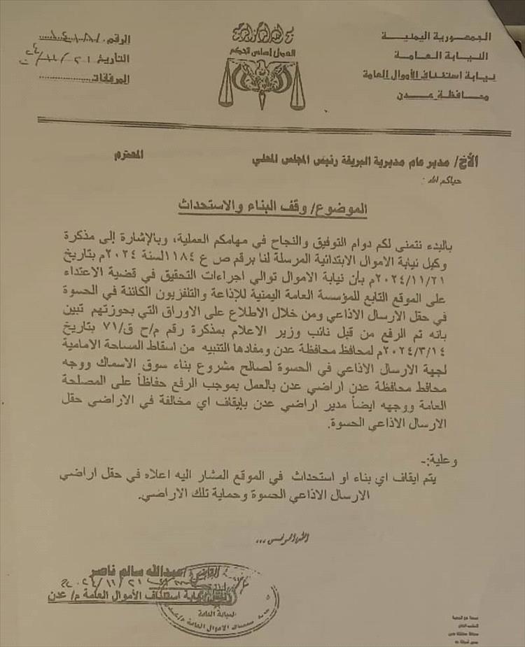 إيقاف أعمال البناء والاستحداث في أراضي الإرسال الإذاعي بقرار نيابة استئناف الأموال العامة بعدن