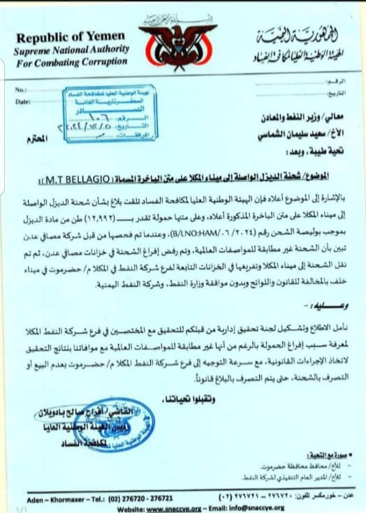 ووجهت الهيئة وزير النفط بتكليف لجنة إدارية للتحقيق مع المختصين في فرع شركة النفط بالمكلا، لمعرفة سبب إفراغ الحمولة بالرغم من أنها غير مطابقة للمواصفات العالمية مع موافاة الهيئة بنتائج التحقيق لاتخاذ الإجراءات القانونية.