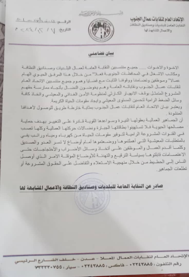 عدن .. في بيان ناري للنقابة العامة للبلديات وصناديق النظافة والتاييد الكامل لبيان اتحاد عمال نقابات الجنوب
