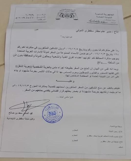 وامر النائب العام مدير المطاربسقطرئ بالكف عن منع الشاكين من السفر والمذكورين اسماءهم تفصيلا في مذكرتهم المؤرخ 3/ 12 / 2019م مالم يرتكبوا جريمة مشهودة او يصدر بحقهم حكم قضائي بمنعهم من السفر .