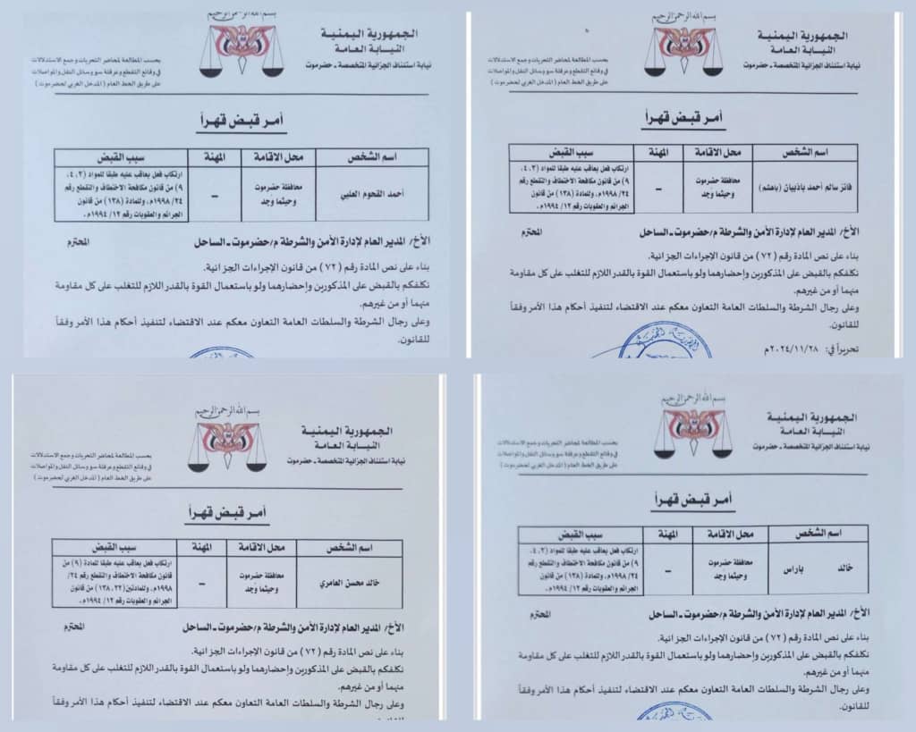 اصدرت النيابة الجزائية المتخصصة في محافظة حضرموت اوامر بالقبض القهري على مجموعة مسلحة من المتقطعين لناقلات الوقود على الطرق الرئيسية مدعومة من بن حبريش ولكن هذه الأوامر تراوح مكانها ولم تلاقي طريقها للتنفيذ من قبل الجهات المختصة في المكلا