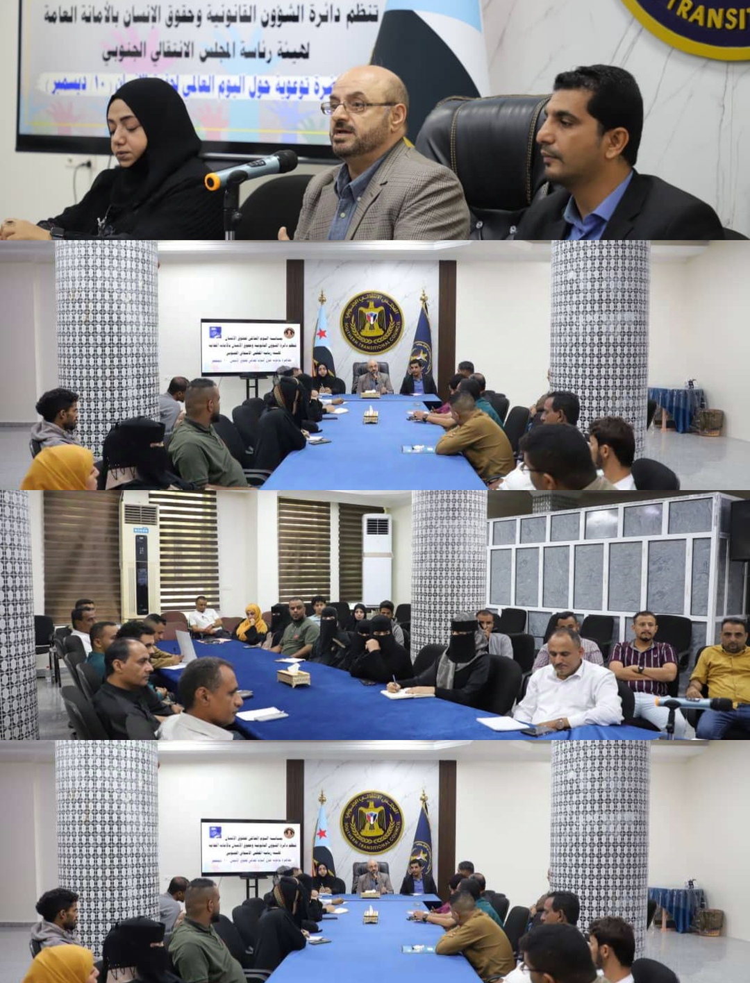 نظمت دائرة الشؤون القانونية وحقوق الإنسان بالأمانة العامة لهيئة رئاسة المجلس الانتقالي الجنوبي، اليوم الثلاثاء، في العاصمة عدن، محاضرة توعوية بمناسبة اليوم العالمي لحقوق الإنسان، الذي يصادف الـ 10 من ديسمبر.