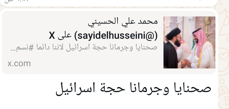 نشر الشيخ محمد علي الحسيني تغريدة في صفحته الشخصية بصفحات التواصل الاجتماعي( اكس) يؤكد فيها بان الجيش الإسرائيلي سيتقدم نحو دمشق وتحديدا الى منطقتي (صحنايا وجرمانا ) .
