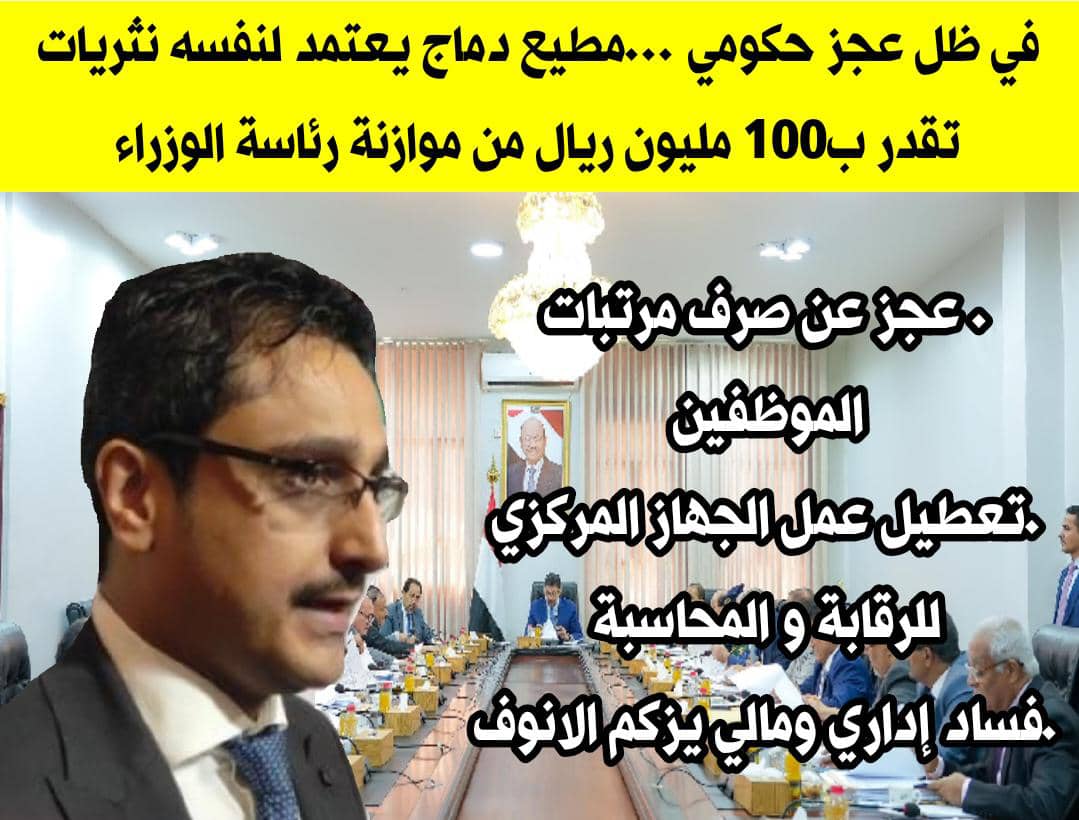 في ظل عجز حكومي … مطيع دماج يعتمد لنفسه نثريات تقدر ب١٠٠مليون ريال شهريا من موازنة رئاسة الوزراء !!