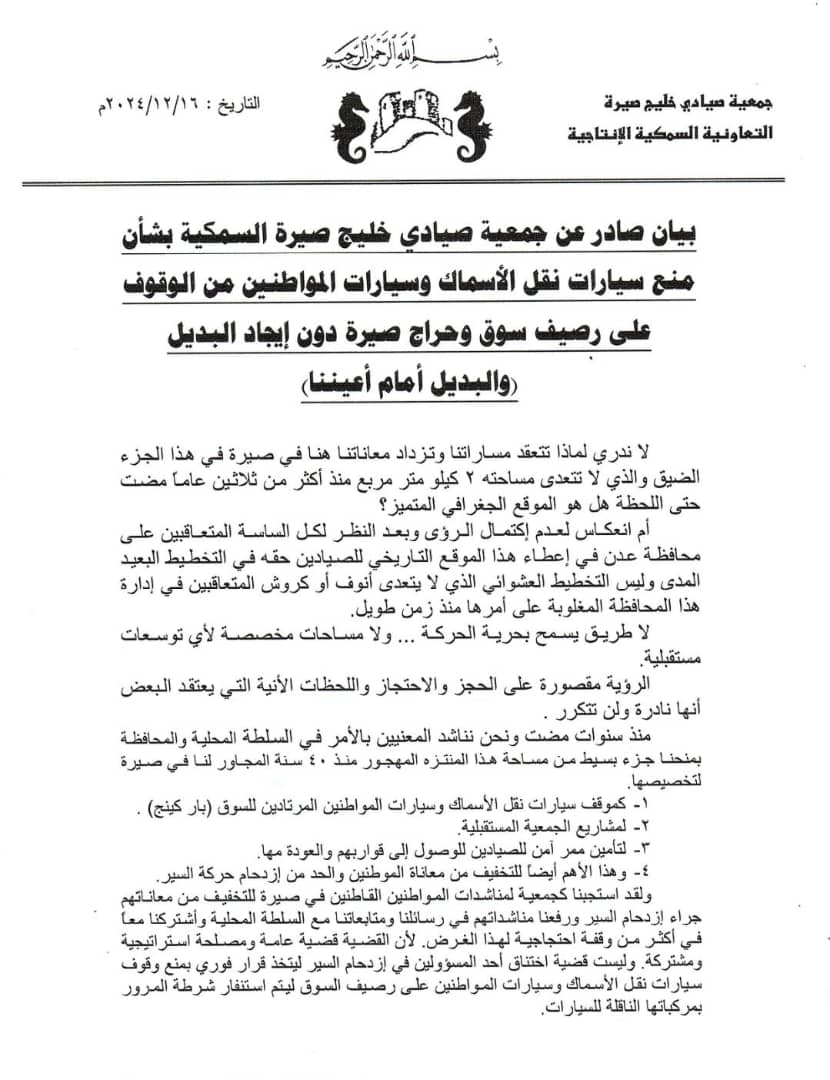 أصدرت جمعية صيادي خليج صيرة السمكية اليوم بيانا جديدا حول منع سيارات الصيد وسيارات المواطنين من الوقوف أمام سوق حرج الصيادين ..