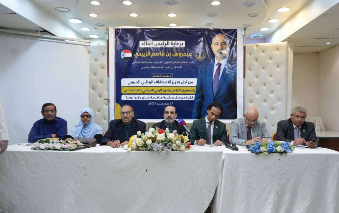 عقد فريق التواصل وتعزيز الوعي السياسي في المجلس الانتقالي الجنوبي، برئاسة عضو هيئة الرئاسة، المحامي علي هيثم الغريب، اليوم الثلاثاء، لقاءً مع منسقية المجلس الانتقالي الجنوبي في جامعة عدن.