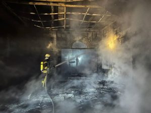 التهمت النيران مساء الليلة اجزاء واسعة من استاد حلب الدولي بعد ان اضرم مجهولين النار فيه
