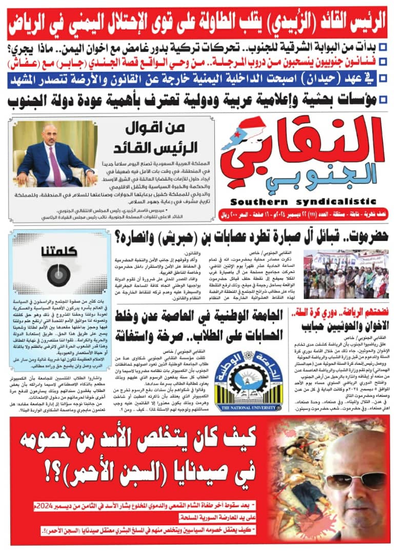 غدا الأحد الموافق 22 ديسمبر 2024م ..العدد الجديد لصحيفة النقابي الجنوبي< 111> في اكشاك بيع الصحف والمجلات
