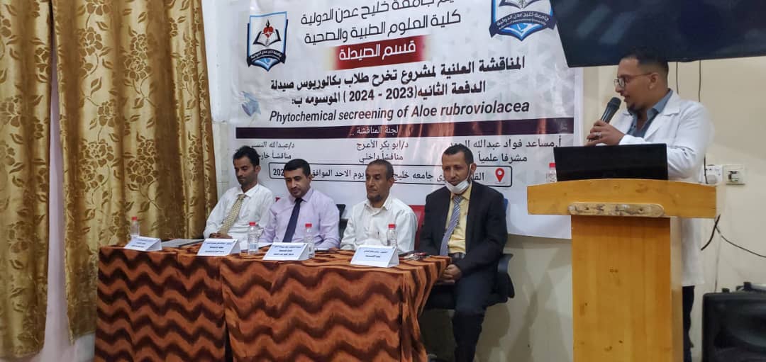 نظمت جامعة خليج عدن الدولية اليوم الإثنين المناقشة العلنية لمشروع تخرج طلاب البكالوريوس قسم الصيدلة الدفعة الثانية، للعام الجامعي 2023- 2024، الموسوم ب”دراسة الكيمياء النباتية لنبات الصبار”.