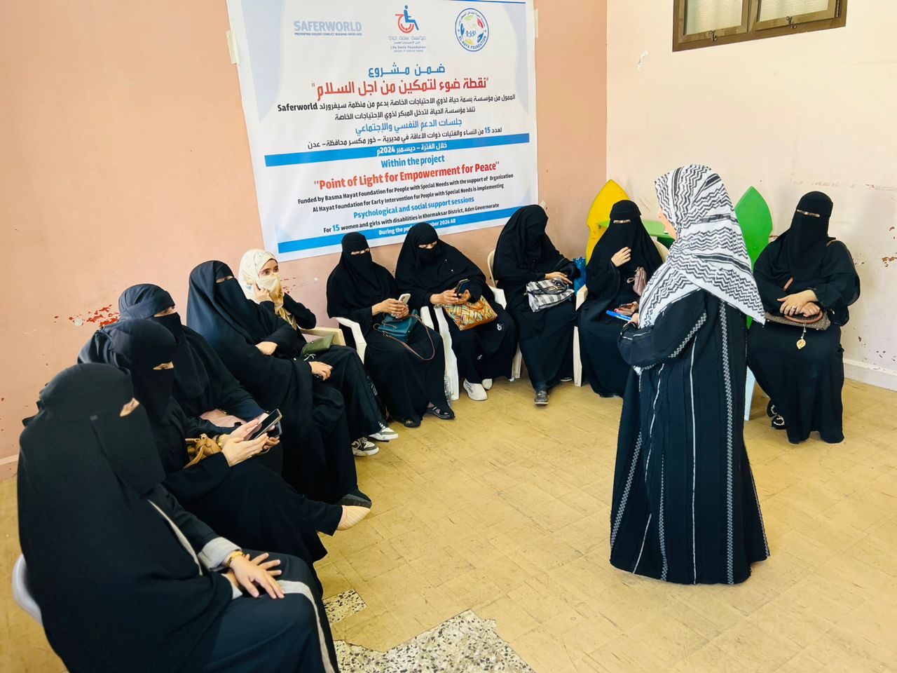 ضمن إطار مشروع” نقطة ضوء لتمكين من أجل السلام” والذي تموله مؤسسة بسمة حياة لذوي الاحتياجات الخاصة وبدعم من منظمة سيفرورلد ، نظّمت مؤسسة الحياة للتدخل المبكر لذوي الاحتياجات الخاصة في عدن، اليوم الثلاثاء، جلسة توعية مميزة خُصصت للأمهات،والبالغ عددهم 15 امرأة.