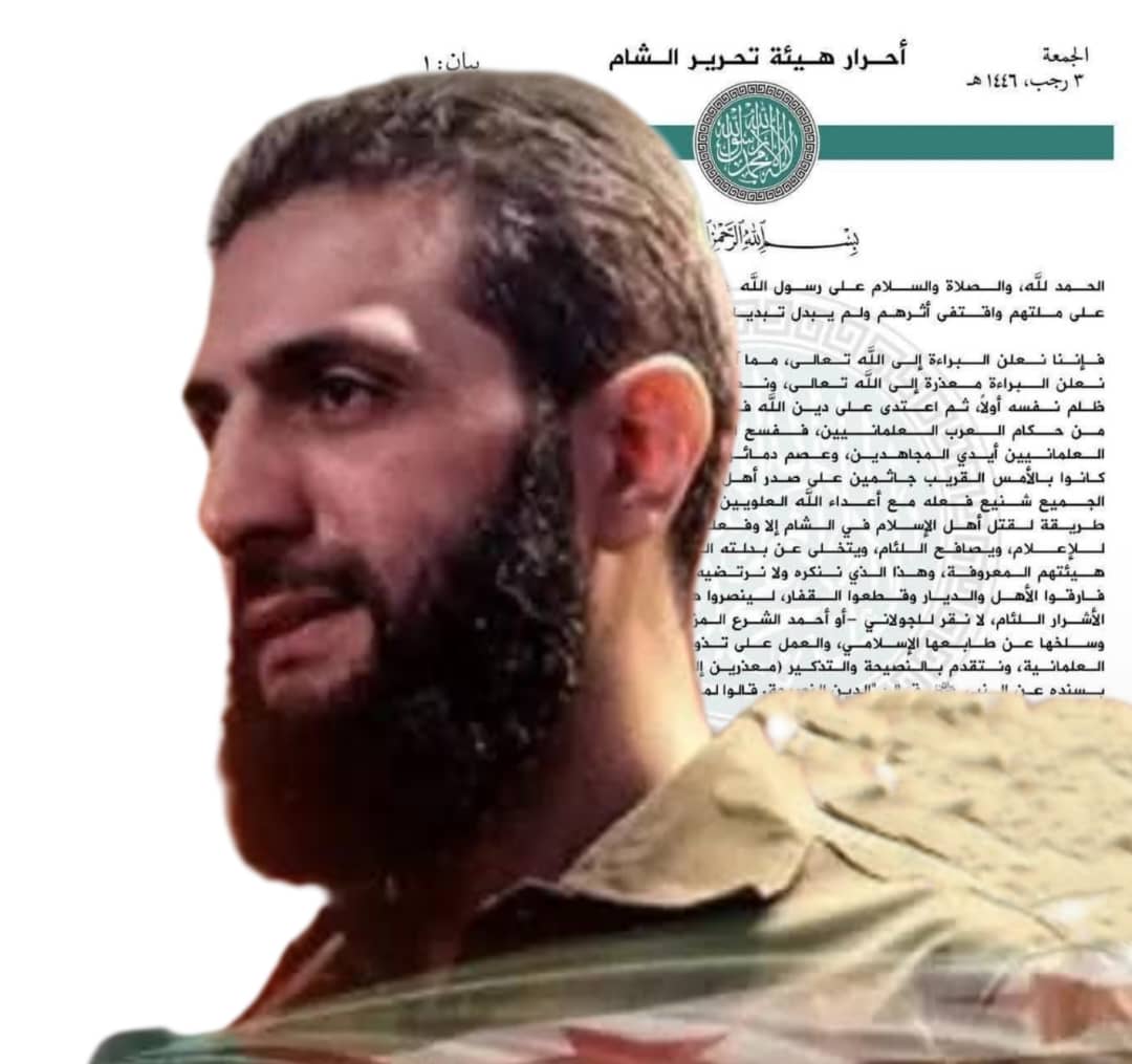 هدد فصيل منشق من هيئة تحرير الشام في بيان منسوب بقتال حكومة احمد الشرع الجولاني لما قال انها وضعت يدها بيد اعداءالله والعلمانيين وفرطت في شرع الله