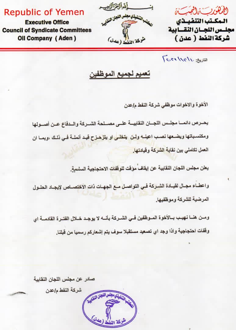 مجلس اللجان النقابية لشركة النفط عدن يعلن إيقاف الوقفات الاحتجاجيه السلمية مؤقتا