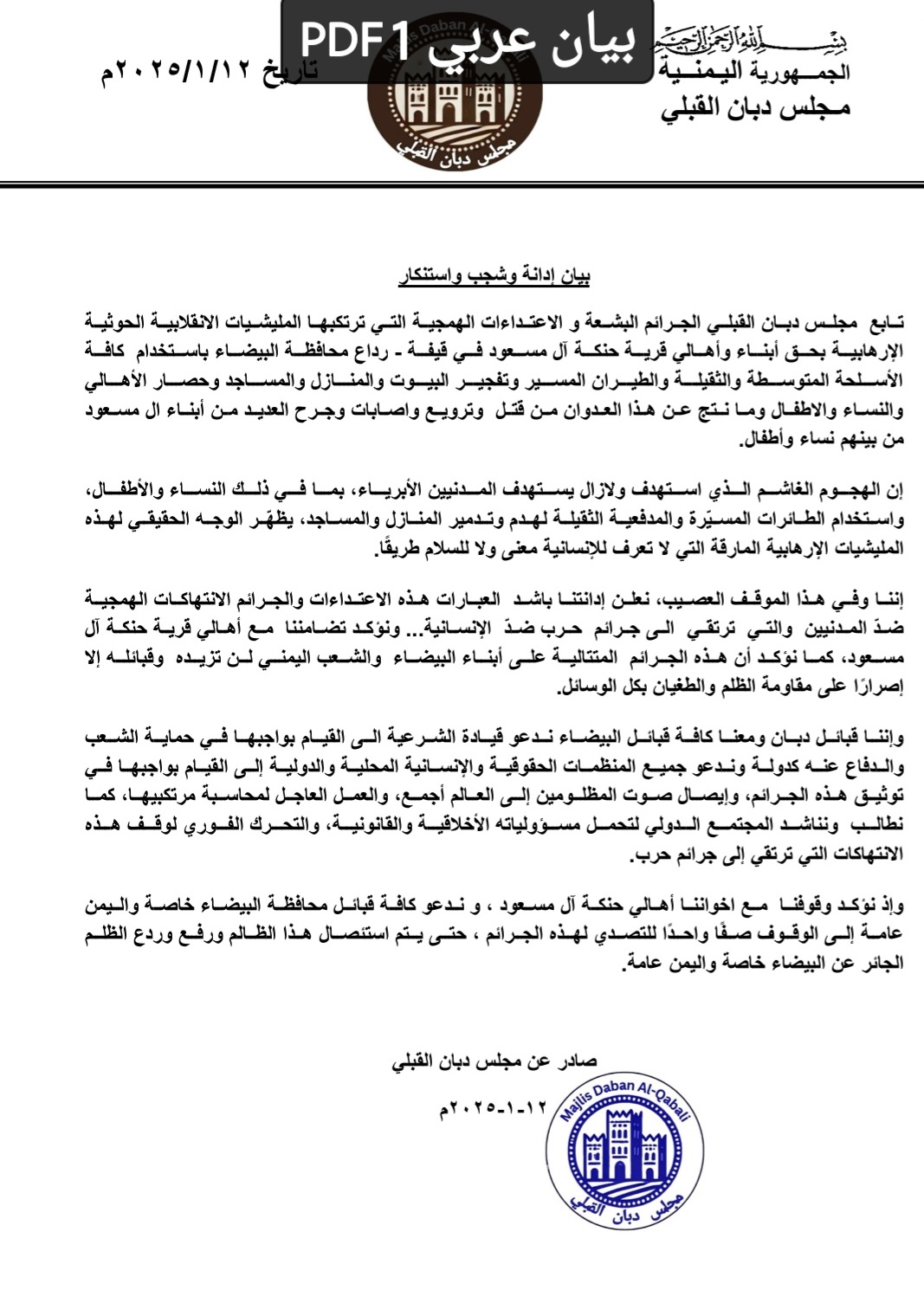 وتابع أن قبائل دبان ومعها كافة قبائل البيضاء تدعو قيادة الشرعية الى القيام بواجبها في حماية الشعب والدفاع عنه كدولة وتدعو جميع المنظمات الحقوقية والإنسانية المحلية والدولية إلى القيام بواجبها في توثيق هذه الجرائم، وإيصال صوت المظلومين إلى العالم أجمع، والعمل العاجل لمحاسبة مرتكبيها، كما تطالب وتناشد المجتمع الدولي تحمل مسؤولياته الأخلاقية والقانونية، والتحرك الفوري لوقف هذه الانتهاكات التي ترتقي إلى جرائم حرب.